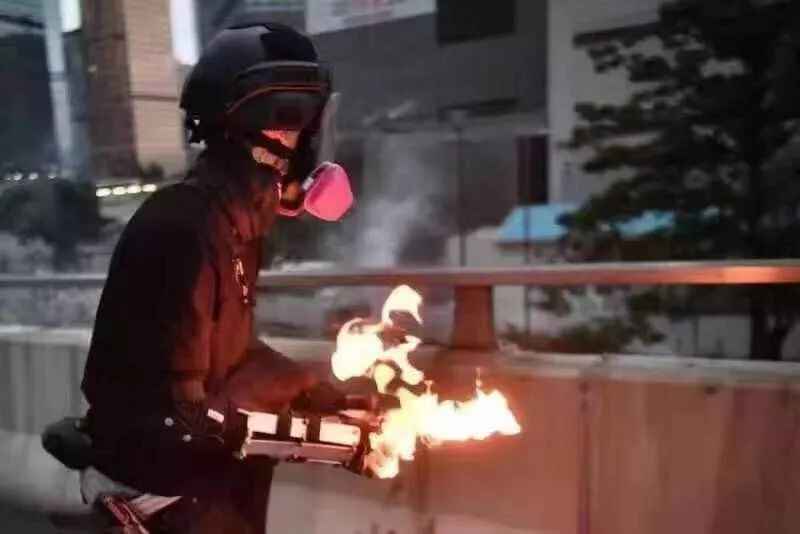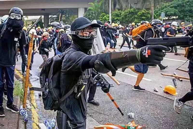 他们戴头盔、穿黑衣、戴口罩,只露出两只眼睛,有的干脆戴上防毒面罩,连眼睛都不敢露;他们手里拿着雨伞、铁棍、激光笔、弓箭、汽油弹,并强行阻碍交通、纵火、砸碎玻璃门窗、围殴平民、袭击警员……