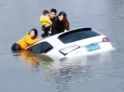 眼看汽车就要沉没,车顶还趴着4个人!