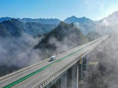 10月29日,龙山县红岩溪镇,车辆行驶在龙永高速公路红岩溪特大桥上,美丽如仙境。