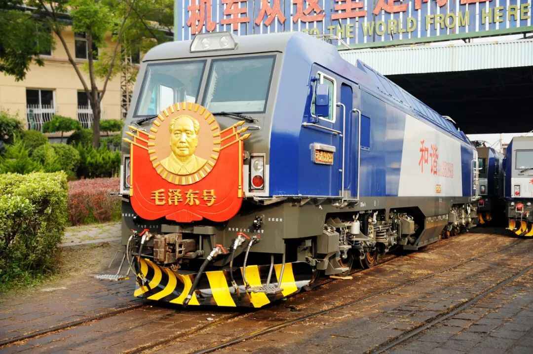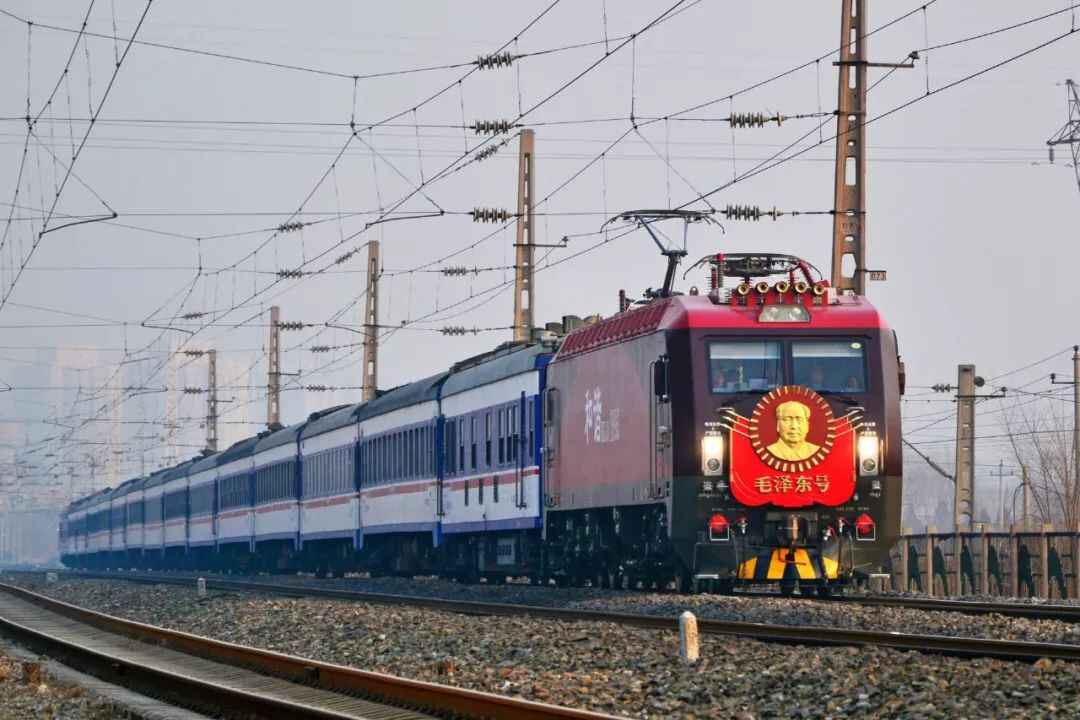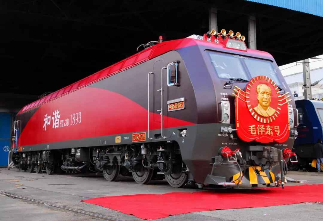 在中国中车大连公司,伴随着清脆的汽笛声和嘹亮的《东方红》乐曲,一台镶嵌毛泽东徽像的“HXD3D1893”机车,缓缓驶出大连机车出车场,交付北京铁路局。这是“毛泽东号”机车的第五次换型。