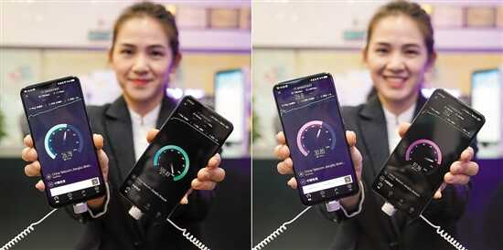 工作人员展示5G 服务与4G 服务的实时下载速度(左图)和上传速度(右图)测试情况 新华社 发