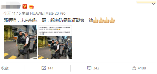 “亲上一线,值得比赞”。“希望能对香港警察有支撑”。↓