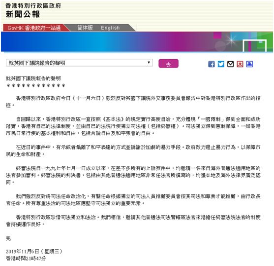 香港特别行政区政府今日(十一月六日)强烈反对英国下议院外交事务委员会报告中对香港特别行政区作出的指控。