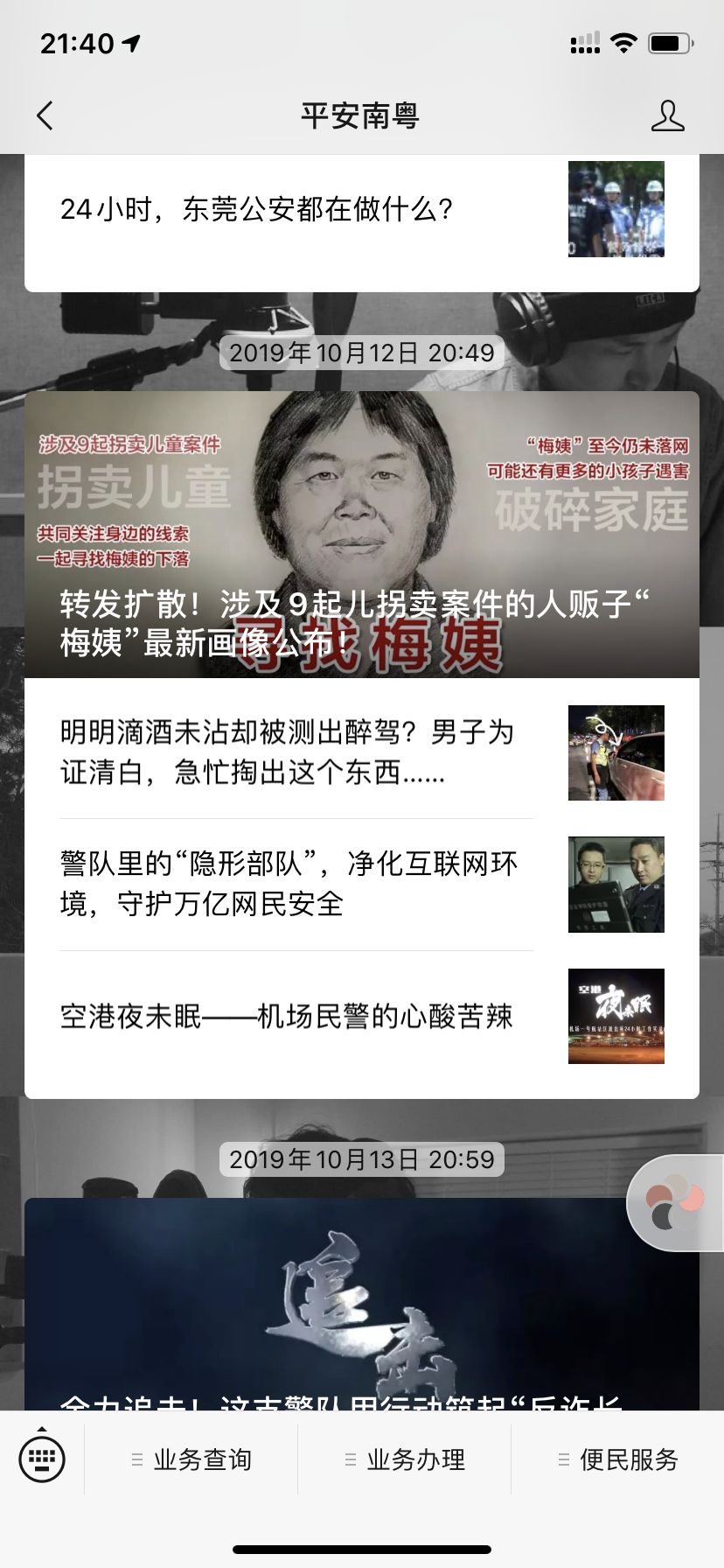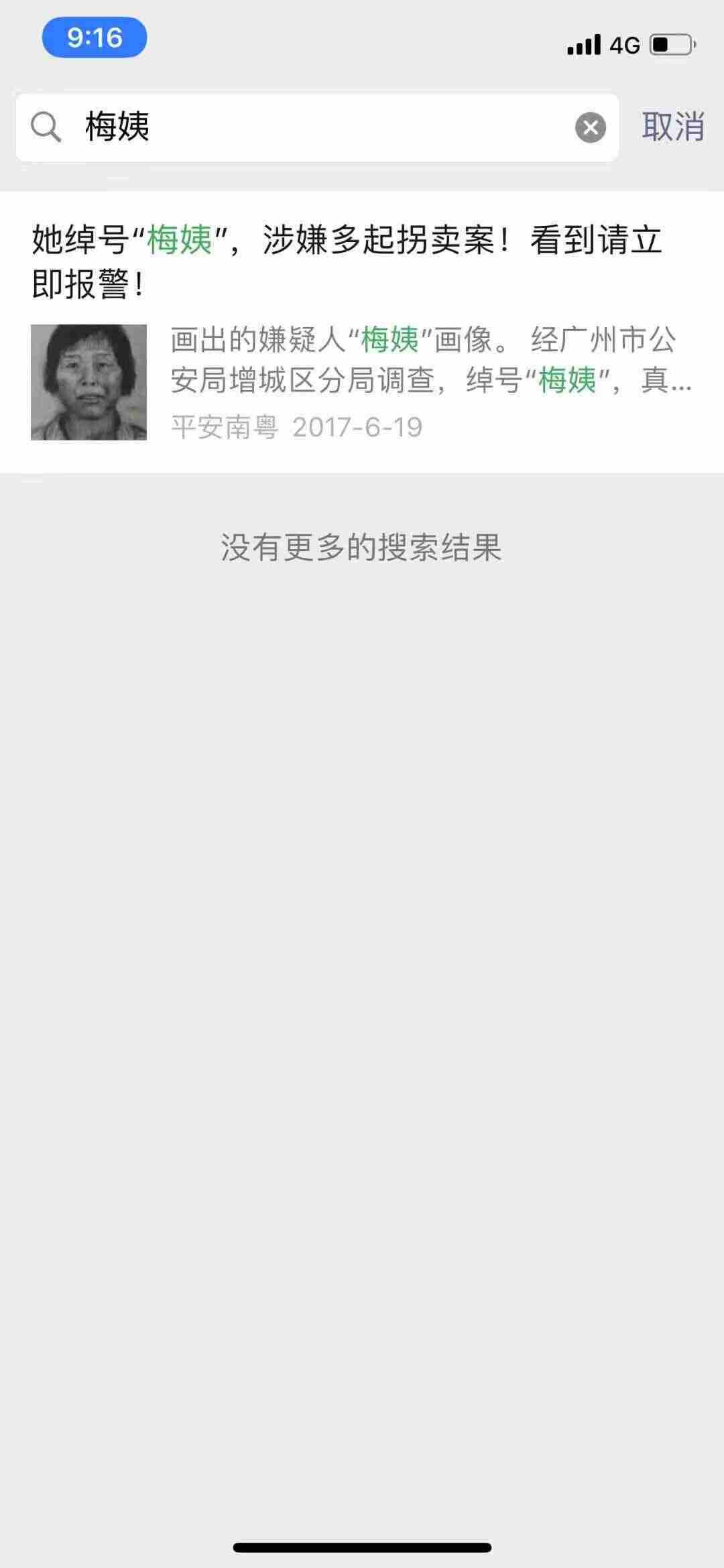 记者以“梅姨”为关键词搜索广东省公安厅微信公众号“平安南粤”,无法搜索到包含这张黑白画像的内容,只有2017年6月发布的一条《她绰号“梅姨”,涉嫌多起拐卖案!看到请立刻报警!》,其中“梅姨”的画像为2017年警方最早公布的画像。推送记录显示,今年10月12日晚,平安南粤曾以“转发扩散!涉及9起拐卖案件的人贩子‘梅姨’最新画像公布!”为标题,以新的黑白画像为题图发布了一篇转载文章,这篇文章目前已经删除。