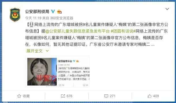 随后,公安部儿童失踪信息紧急发布平台官方微博发布消息:网络上流传的广东增城被拐9名儿童案件嫌疑人“梅姨”的第二张画像非官方公布信息,“梅姨”是否存在、长相如何,暂无其他证据印证。广东省公安厅未邀请专家对“梅姨”二次画像,广东警方仍在积极寻找其余7名儿童下落。ccser儿童失踪预警平台不是公安机关官方权威平台,请大家不信谣、不传谣。