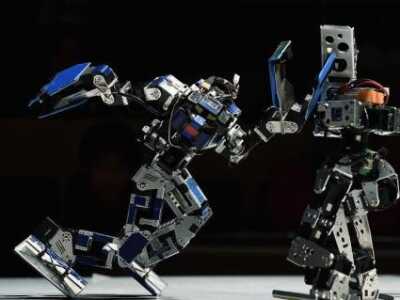 当地时间2018年2月25日,日本东京举行第32届ROBO-ONE双足机器人对抗锦标赛。比赛中,机器人在参赛者的操控下展开了激烈搏斗,一招一式非常有范儿。图片来源:视觉中国