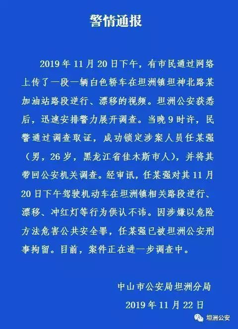 据坦洲公安分局通报:根据网友上传的视频,2019年11月20日晚9点左右,民警通过调查取证,成功锁定涉案嫌疑人任某,并将其带回公安机关调查。经审讯,任某对其当天下午驾驶机动车在坦洲镇相关路段逆行、漂移、冲红灯等行为供认不讳。