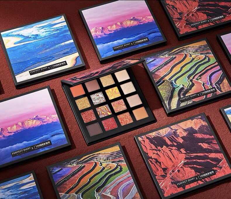 完美日记与中国国家地理联名的新品十六色眼影,以中国山河美色为灵感,取材于真实的中国地形地貌,有“赤彤丹霞”、“粉黛高原”、“碧蓝湖泊”与“焕彩梯田”四个主题,创下18.6万件的销售记录。