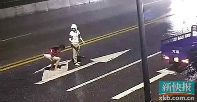 女友上前劝阻时被男友阿峰用右手肘击到胸口后蹲在车道上。 (视频截图)