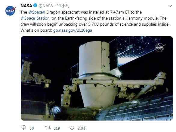 中新网12月9日电 据外媒报道,美国国家航空航天局(NASA)消息称,美国“龙”货运飞船已成功对接国际空间站。