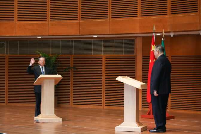 7月17日,高开贤(左)宣誓就任澳门特区立法会主席。新华社记者张金加摄