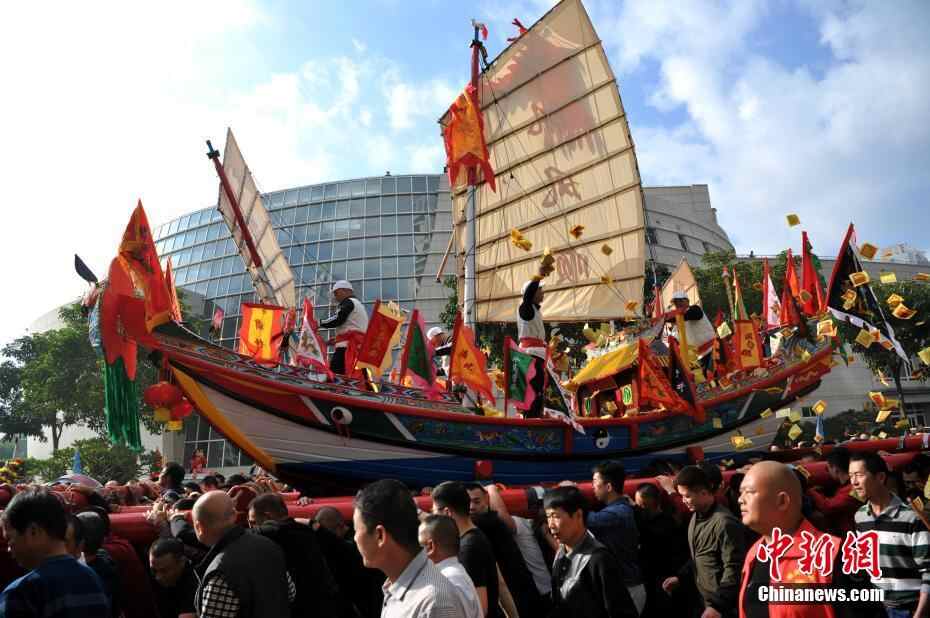 12月14日,厦门海沧钟山送王船文化节在海沧钟山水美宫举行,上千名海峡两岸民众共同见证了这三年一次的民俗盛典。送王船也称“烧王船”“祭王船”“贡王”等,俗称“做好事”,是一种民间消灾祈安的祭典醮会,至今已有600多年的历史,2011年被列入国家级非遗代表性项目名录。图为当地民众扛着王船游境。 中新社记者 张斌 摄