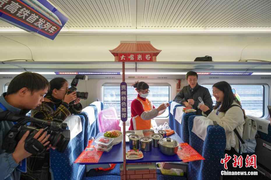 12月16日,随着开往成都南的C6008次动车驶出贵阳北高铁站,标志着成都至贵阳高铁(简称成贵高铁)宜宾至贵阳段开通运营,成贵高铁全线通车,成都与贵阳两个省会城市最快2小时58分可达。图为在C6008次动车上,媒体记者品尝贵州特色小吃。中新社记者 贺俊怡 摄