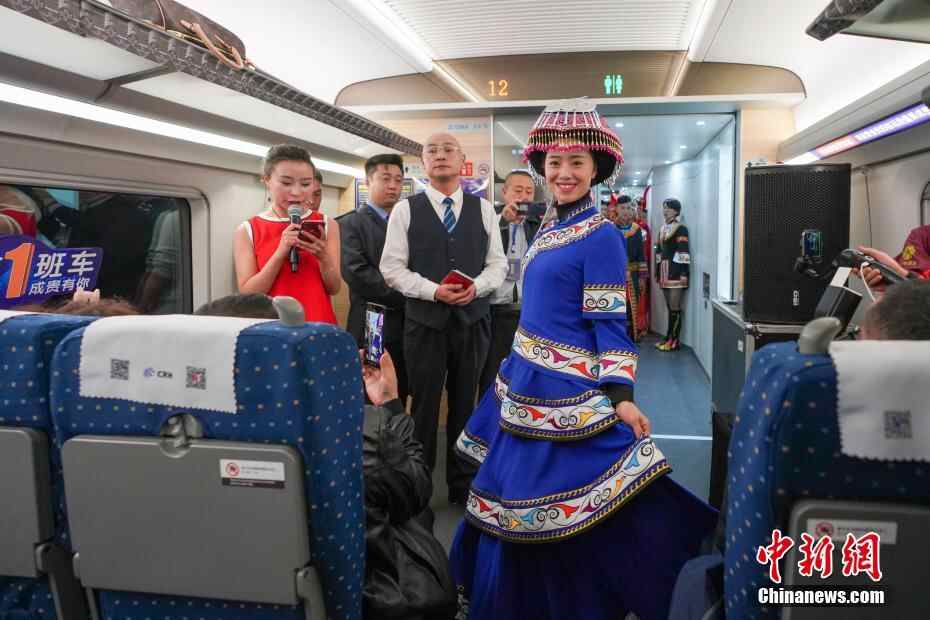 12月16日,随着开往成都南的C6008次动车驶出贵阳北高铁站,标志着成都至贵阳高铁(简称成贵高铁)宜宾至贵阳段开通运营,成贵高铁全线通车,成都与贵阳两个省会城市最快2小时58分可达。图为在C6008次动车上,来自贵州大方县的演员进行民族服饰展示。中新社记者 贺俊怡 摄
