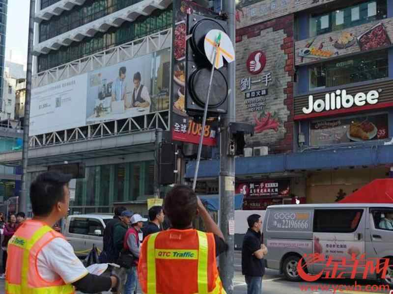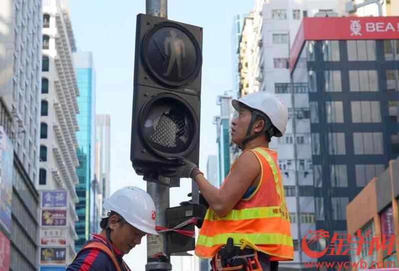 政府修理弥敦道交通灯 羊城晚报特派香港报道组摄