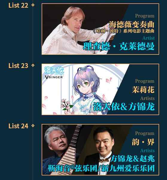 作为B站打造的晚会,UP主们的表演也必不可少。新年晚会还邀请了音乐区知名UP主墨韵Moyun、孟晓洁Jae、易言、陈乐一等人表演国风、动漫歌曲。更具未来感和B站特色的是,晚会上虚拟偶像洛天依也将和中国著名琵琶演奏家,现代五弦琵琶代表人物方锦龙合作一曲《茉莉花》,打破虚拟和现实的边界。