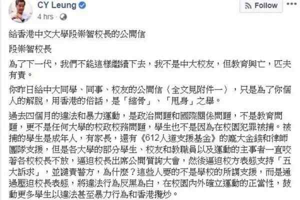 处于风口浪尖的段崇智却只是避重就轻地回应。12月3日,他发公开信声称,要与港中大同行重建美好校园,但仍未对暴力行为进行任何谴责。