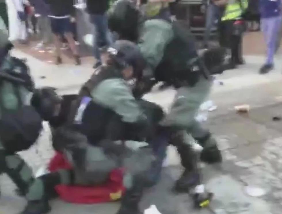 今天(22日)下午,一批暴徒在香港中环聚集,期间再次作出从旗杆上拆下五星红旗丢在地上的恶行。防暴警员随后到场将国旗收起,并当场拘捕两名男子。