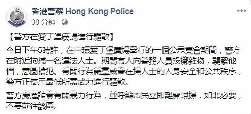 香港警方22日下午17时37分在脸书发文表示,今日下午17时许,在中环爱丁堡广场举行的一个公众集会期间,警方于附近拘捕一名违法人士。期间有人向警务人员投掷杂物,袭击他们,意图抢犯。有关行为严重威胁在场人士的人身安全和公共秩序,警方正使用最低所需武力进行驱散。 警方严厉谴责有关暴力行为,并呼吁市民立即离开现场,如非必要,不要前往该区。