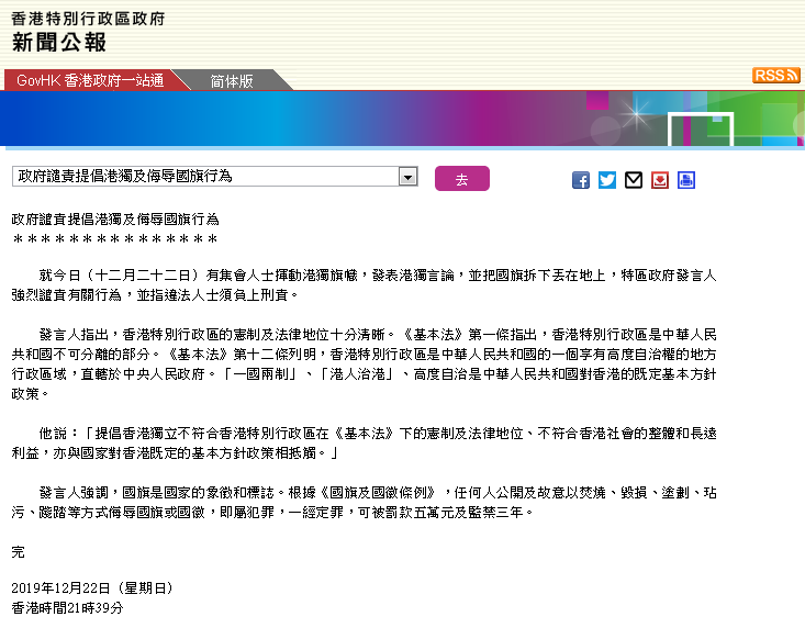 就今日(十二月二十二日)有集会人士挥动港独旗帜,发表港独言论,并把国旗拆下丢在地上,特区政府发言人强烈谴责有关行为,并指违法人士须负上刑责。
