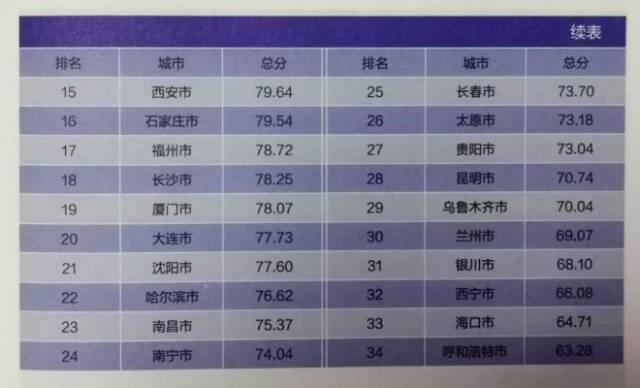 从具体得分结果来看,企业家营商环境主观评价总体得分高于90分的城市有5个,占比为15%,分别是广州市、深圳市、上海市、北京市和南京市;得分在80分到90分之间的城市有9个,占比为26%,分别是杭州市、济南市、宁波市、武汉市、成都市、郑州市、重庆市、天津市和合肥市。