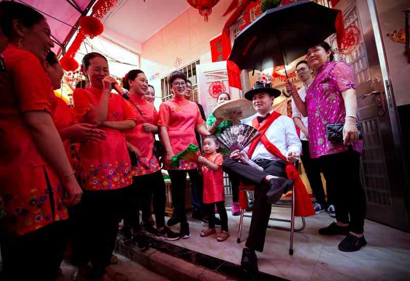 独特的渔歌对唱环节,新郎官要保持这个姿势几个小时,接受亲人们的祝福 赵玄鹏 摄