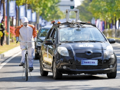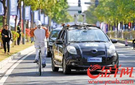 比赛设置了多个场景,图为自动驾驶车辆绕开作为障碍物的假人和自行车 记者邓勃摄