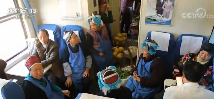 列车长 胡贵川:我们经常看到七八十岁的老人家,挑几十斤菜,到凯里去卖,卖了之后,换几十块钱回来。来回需要七个小时他们才到回家。七个小时里他们都是自己带起米饭和一点盐菜,到车上两口就吃了,都舍不得在凯里站吃碗粉或者炒饭。