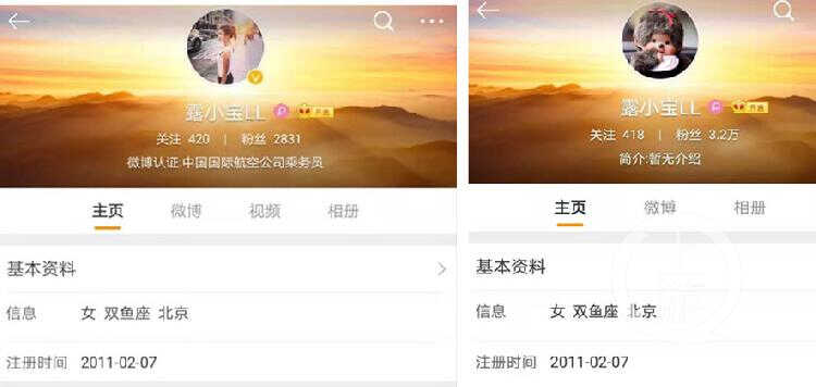 ▲@露小宝LL删除微博内容前后的主页对比,另外已取消认证。图片来源/网页截屏