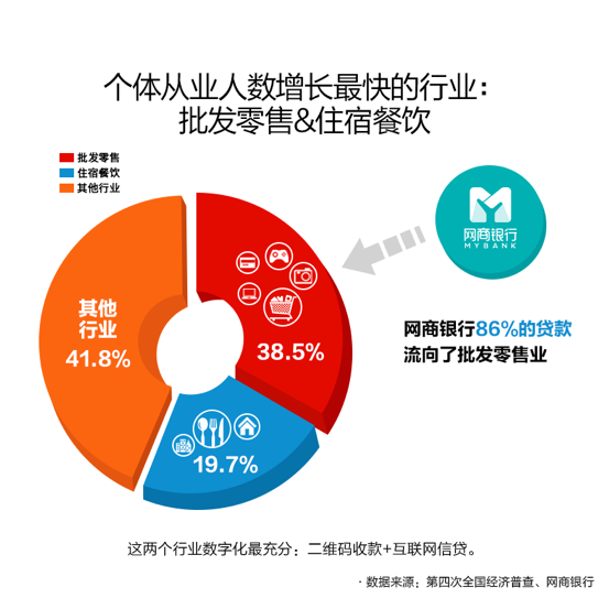 据专为个体户、小微经营者提供信贷的网商银行数据,截至2018年末各项贷款中,流向批发零售业的比例高达86 %,与研究结论高度一致。