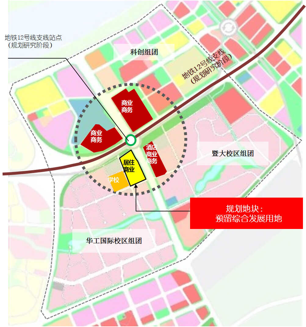 而根据本次规划的地块周边功能分布示意图,处于规划研究阶段的地铁12号线支线将东西横穿国际创新城南岸起步区。其中,规划研究的支线站点则位于华工国际校区组团预留综合发展用地的东北处。