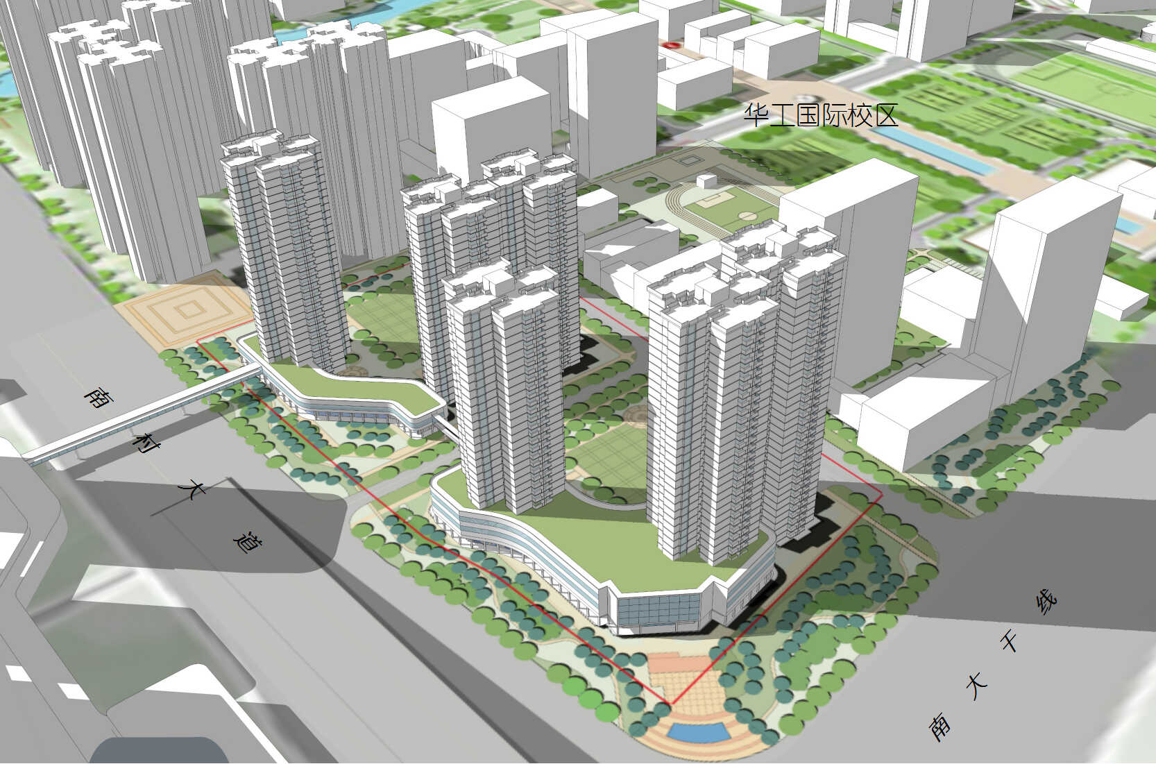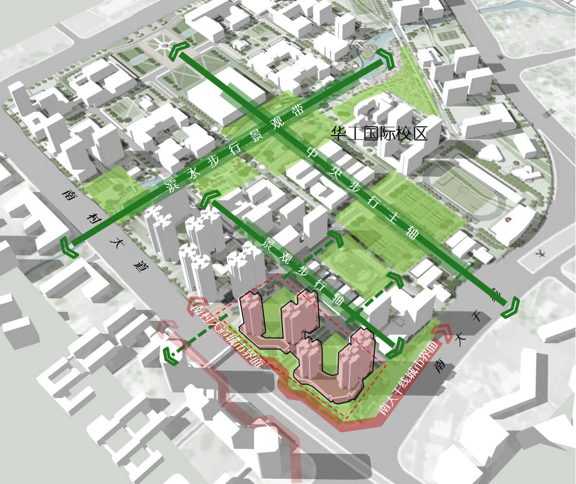 此外,按照概念方案,地块将设计为半围合式组团、开敞内部庭院、协调沿街界面,打造“一轴、两界面、两通道”的开敞空间体系:“一轴”即打造南北向景观步行轴,融入华工国际校区组团开放空间体系;“两界面”为沿南大干线,南村达到打造两条连续的临街界面;“两通道”则是东西向两条联系通道,加强地块与周边的空间延续。