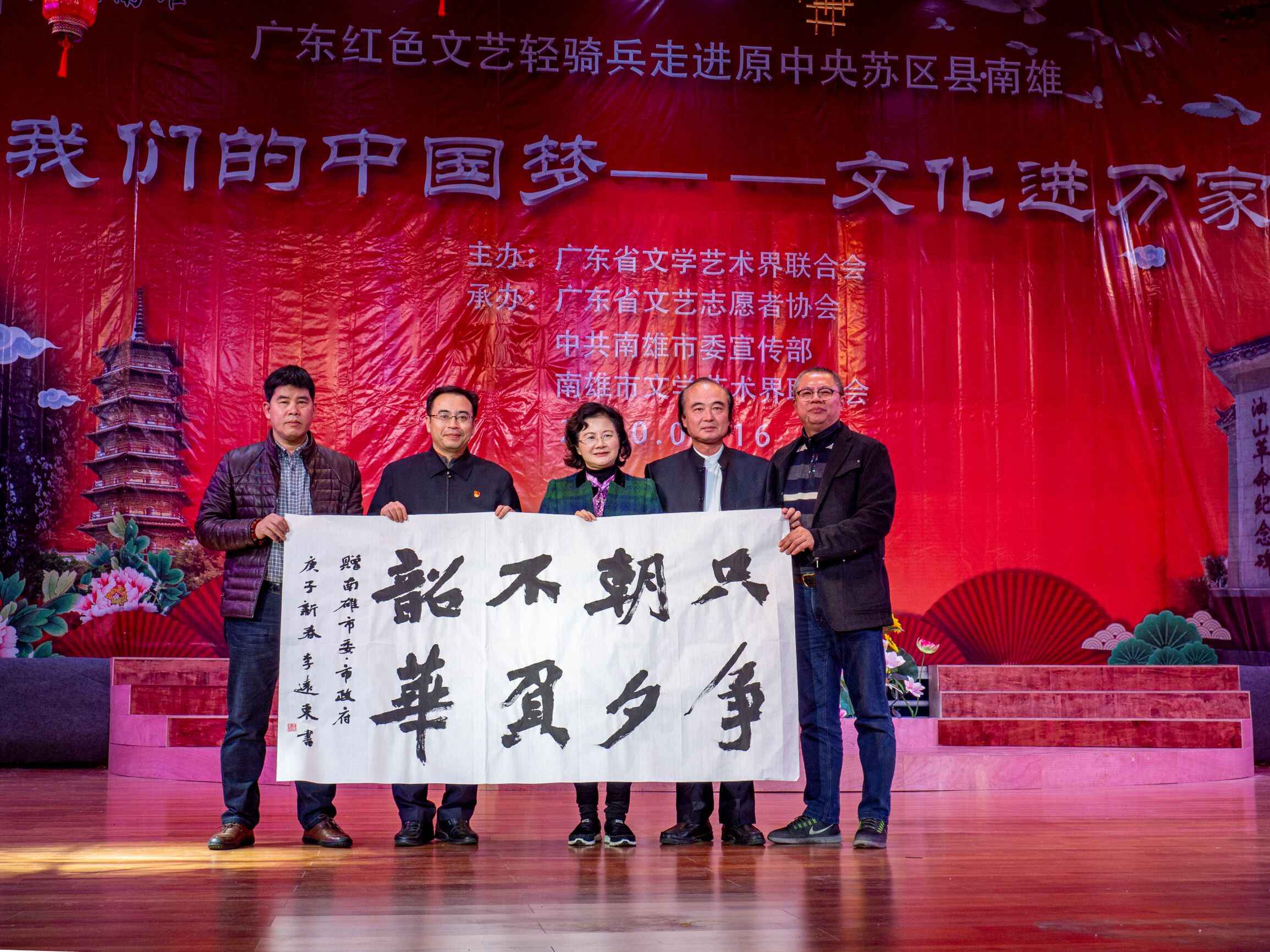 当晚,文艺志愿者在南雄大会堂为南雄人民奉献了一台精彩的文化盛宴。在晚会现场,广东省文联党组书记王晓向当地赠送了由省美协专职副主席王永等创作的美术作品《雄州春韵》、由广东书法院院长李远东创作的书法作品《只争朝夕 不负韶华》。