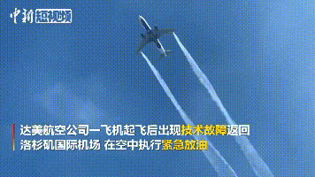 当地时间2020年1月14日,美国达美航空一架波音飞机在起飞后不久报告发动机故障,飞行中紧急倾倒燃油,以减轻着陆重量。图片来源:中国新闻网视频截图。