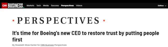 不过,哈佛商学院教授坎特在CNN上刊文称,波音试图控制损失的努力已经失败。坎特指出,波音正面临着信任问题。在安全事故发生后,它如何能证明这不会再发生,下次会有所不同?波音需要数年时间才能摆脱挥之不去的疑虑。