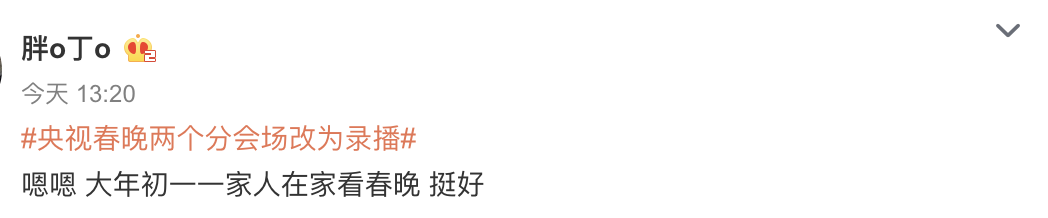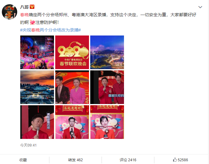 据悉,鉴于近期防疫情势,2020总台春晚的河南郑州、粤港澳大湾区两个分会场决定以录制形式进行。网民对此决定也表达了支持↓↓↓