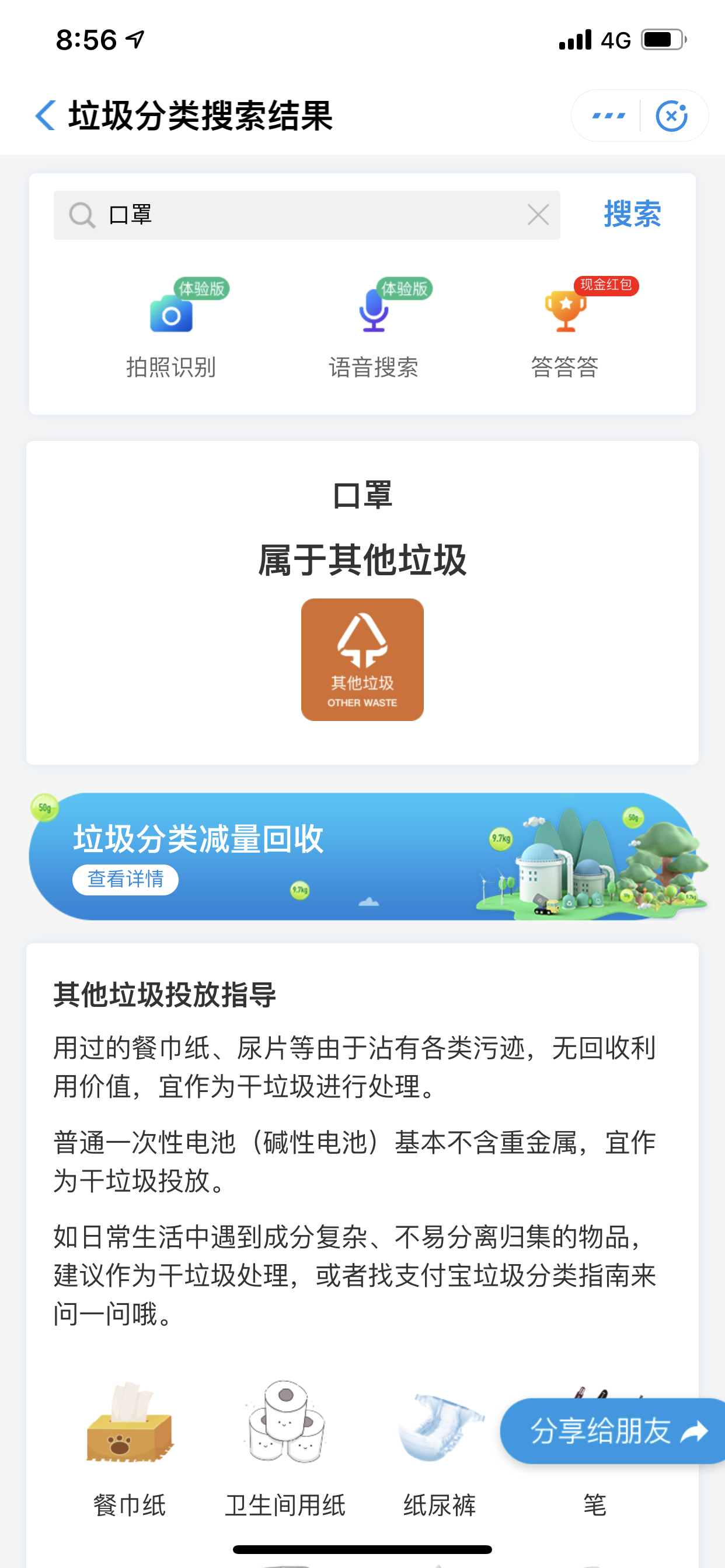 支付宝“垃圾分类指南”,将口罩定义为“其他垃圾”