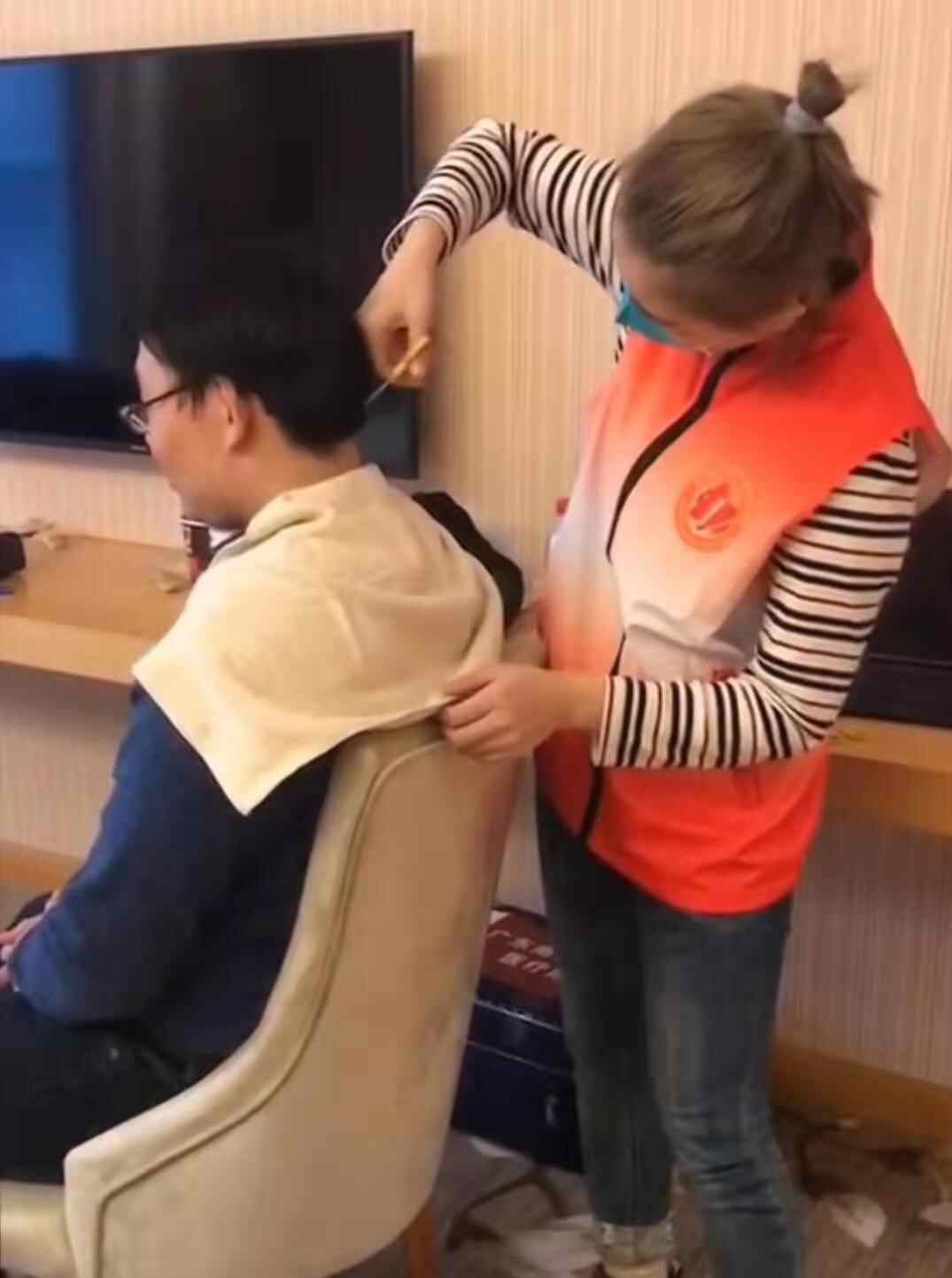 肖冠华医生头发太长不符合感控要求,队友帮忙剪