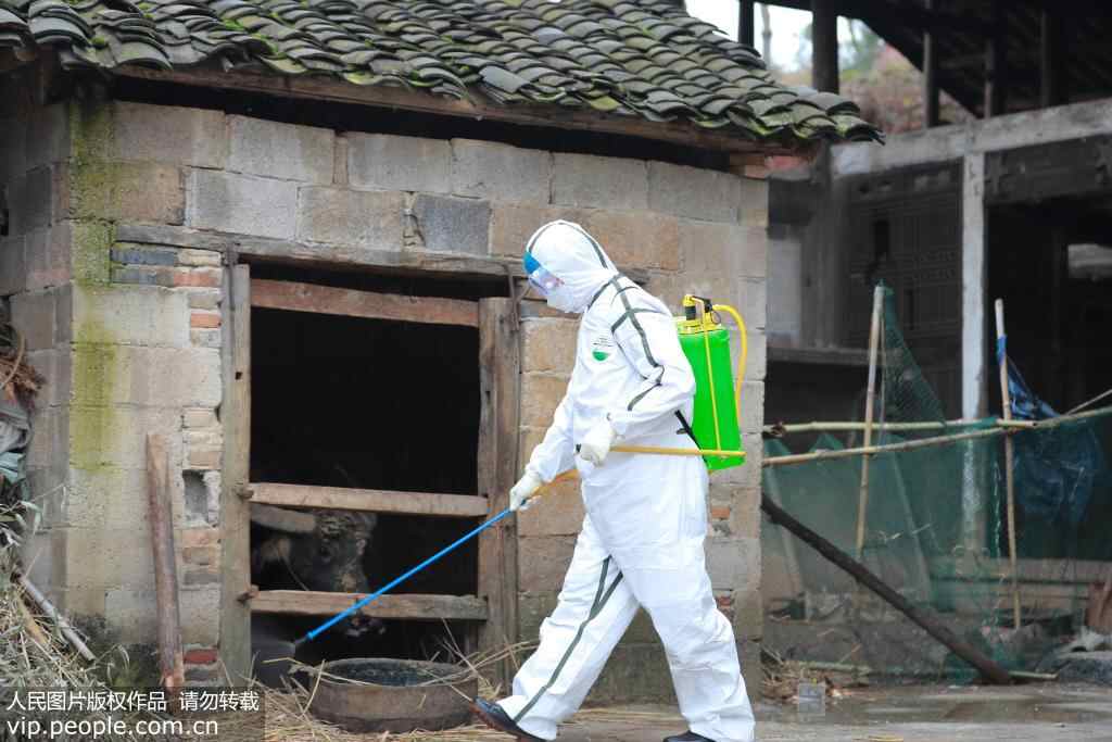 2020年1月27日,卫生防疫人员在贵州省铜仁市玉屏侗族自治县田坪镇罗家寨村村民家中开展消毒防疫工作。作者:胡攀学