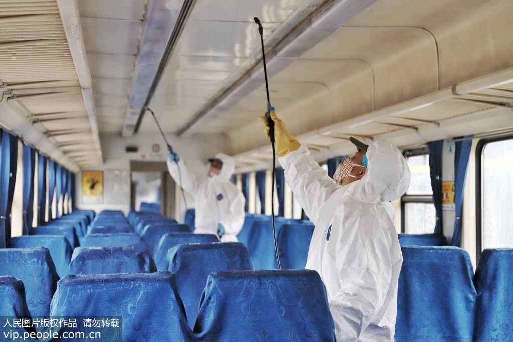 2020年1月27日,杭州铁路客运段,正在对进库列车彻底消毒。作者:周围