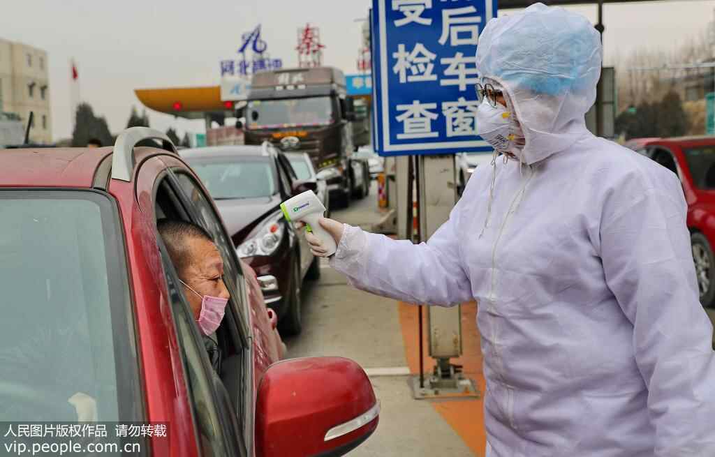 2020年1月27日,位于河北省秦皇岛市海港区的京(北京)沈(沈阳)高速公路秦皇岛东口,秦皇岛市医护人员为过往车辆上的人员检测体温。作者:曹建雄