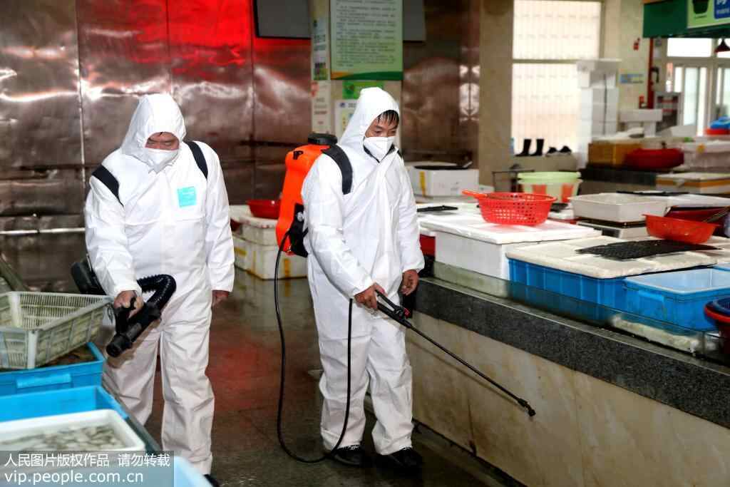 2020年1月27日,浙江省台州温岭市大溪镇组织力量,对农贸市场进行防疫消杀。作者:杨鹏