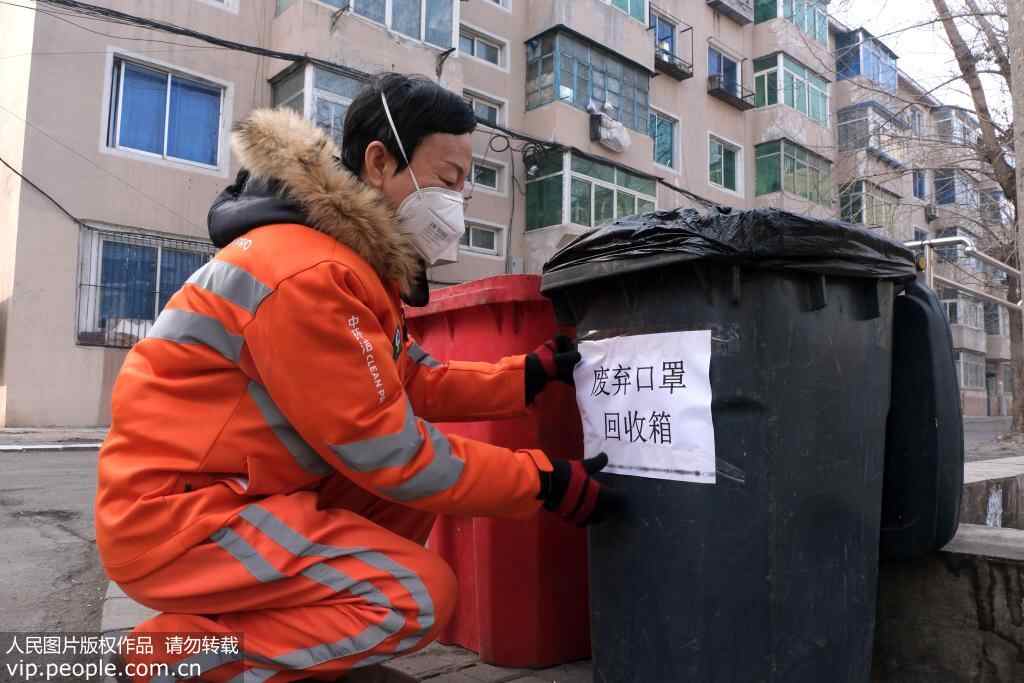 2020年月1月28日,沈阳铁西区园西小区工作人员在设置废弃口罩专用桶。作者:黄金崑
