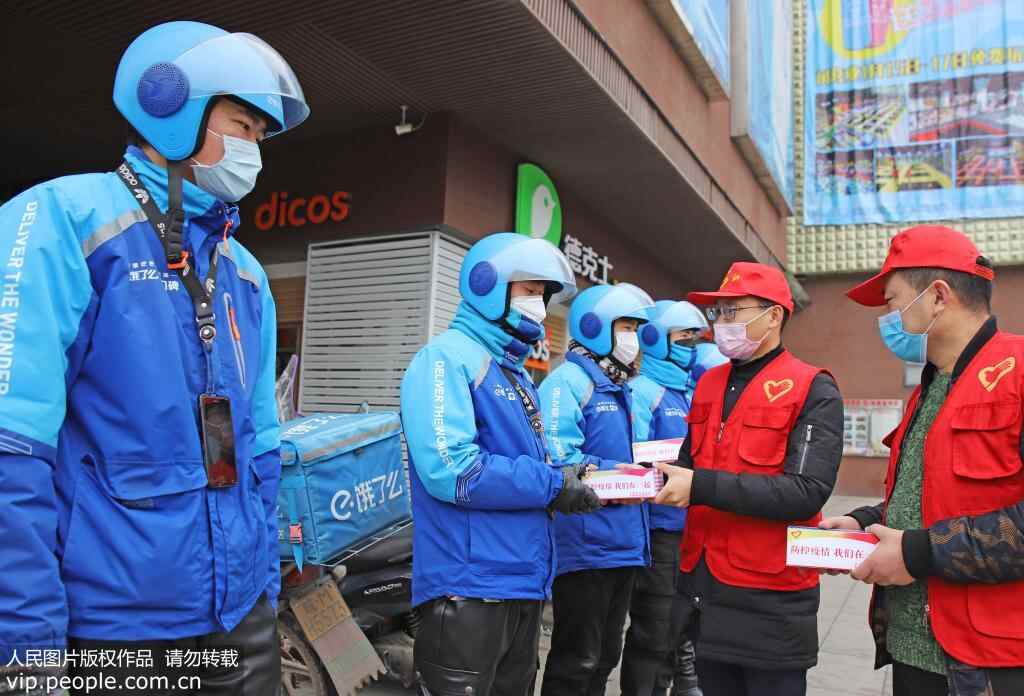 2020年1月28日,安徽省全椒团县委志愿者赠送防护口罩给外卖小哥。作者:禹强云