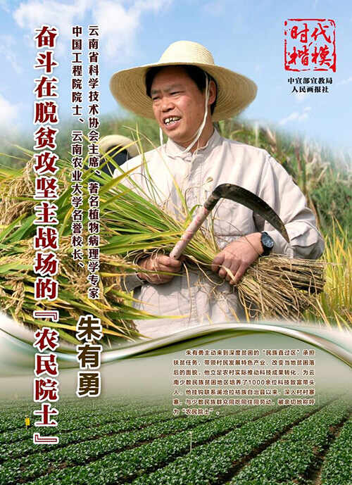 朱有勇是中国工程院院士、云南农业大学名誉校长、云南省科学技术协会主席,我国著名的植物病理学专家。他始终牢记共产党人的初心和使命,积极投身脱贫攻坚事业,主动来到深度贫困的“民族直过区”承担扶贫任务,带领村民发展特色产业,改变了当地贫困落后的面貌。他致力农业科学研究,取得多项重大科研成果,立足农村实际推动科技成果转化,创办院士科技扶贫指导班,为云南少数民族贫困地区培养了1000余位科技致富带头人。他情系“三农”,扎根边疆,挂钩联系澜沧拉祜族自治县以来,深入村村寨寨,跑遍田间地头,与少数民族群众同吃同住同劳动,受到各族群众真心爱戴和社会各界高度赞扬,被亲切地称呼为“农民院士”。先后荣获国家科技进步二等奖、“全国优秀共产党员”“全国杰出专业技术人才”“全国模范教师”等荣誉称号。【详情】