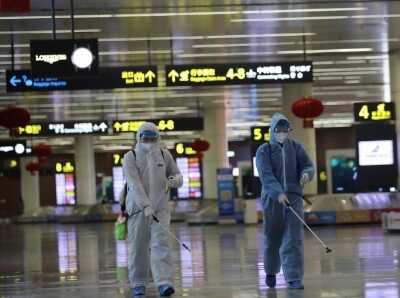 中新社记者于海洋摄。中新社记者于海洋摄工作人员在消毒。中新社记者于海洋摄1月30日,在沈阳桃仙国际机场T3航站楼,旅客戴...