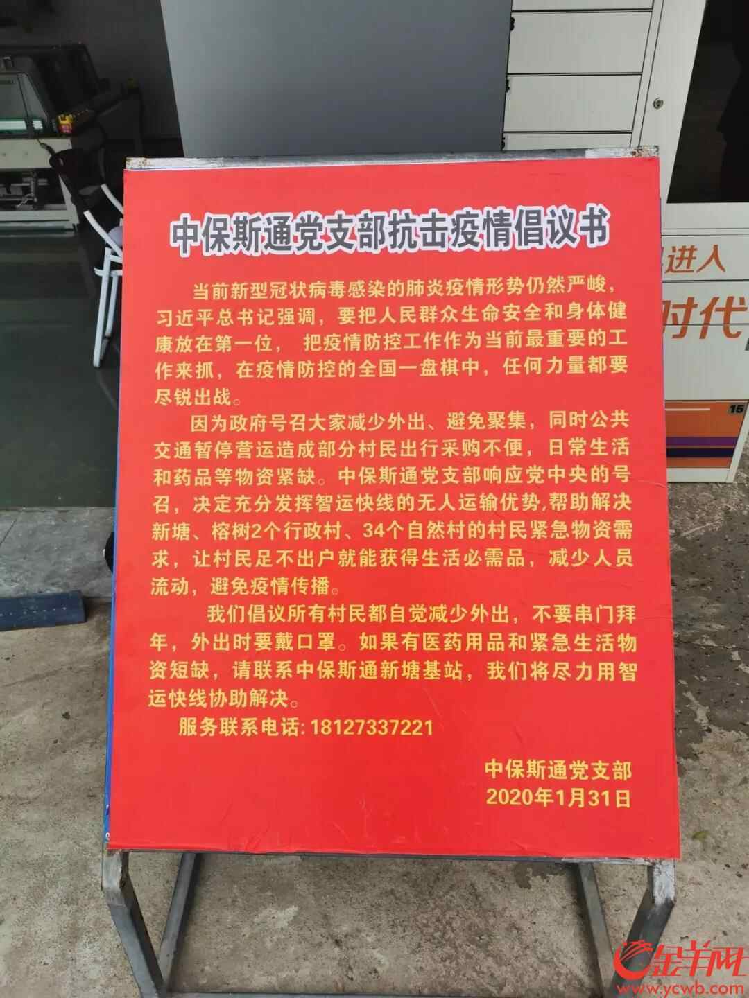 2月1日,首批医用口罩、板蓝根颗粒、银黄口服液、三蛇胆川贝糖浆、藿香正气水等医药物资已经分发到新安镇政府、新安居委会及已经开通智运快线的新安村、新塘村、榕树村、山西村等村委会,部分物资连夜送到了村民的手中。目前,大米等生活物资也已经到位,中保斯通党支部在两个村委会和榕树墟等公众场所张贴了服务公告,物资正按村委会的安排和电话预约陆续有序发放给急需的村民。