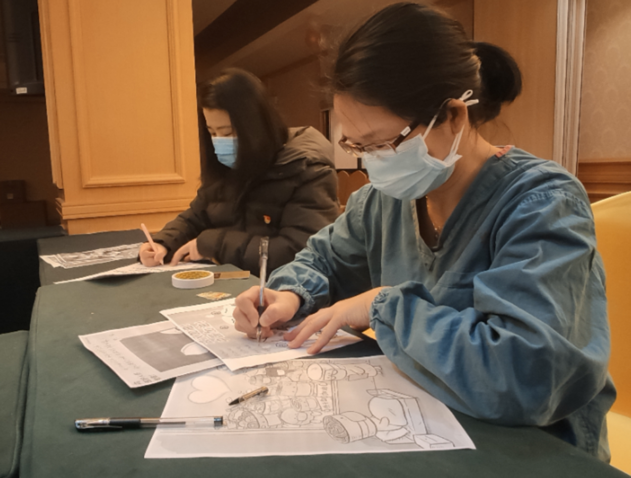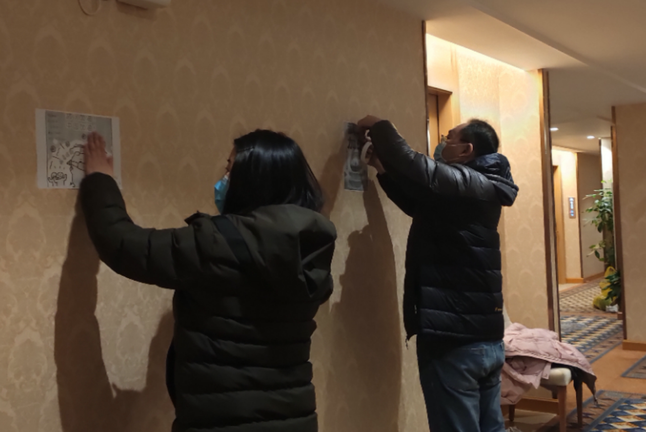 此外,还有一幅幅色彩鲜明、轻松活泼的漫画出现酒店走廊墙壁上,配着或幽默俏皮,或富有哲理的文字,吸引过往医护人员驻足观赏。