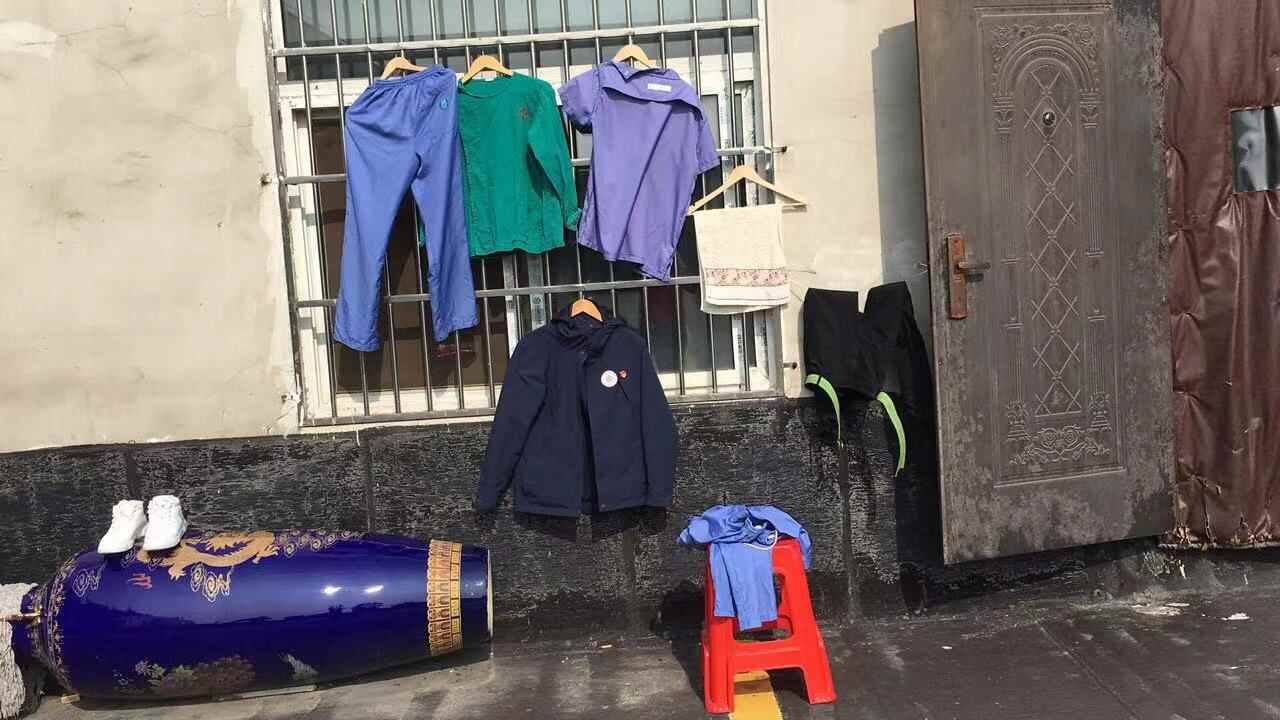 上完夜班,趁着阳光好晾晒消毒衣服