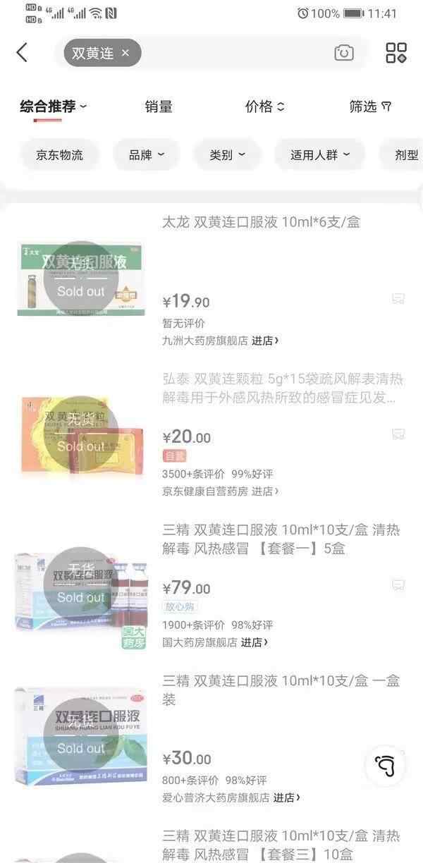 很多人在药店抢不到双黄连口服液,随即把目光转向了网络电商平台。截至目前京东、淘宝等几家电商平台均显示双黄连口服液无货状态。